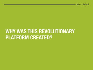 The document describes a new online recruiting platform called JobandTalent that aims to connect professionals with career opportunities through social networks. It allows users to find jobs that match their profile and then leverage their contacts to find referrals. Companies can also use contacts to attract top talent. The platform is supported by recruitment consultants and aims to significantly reduce costs compared to traditional methods while maximizing the reach of job postings. It has grown rapidly since launching in 2011 and become a key tool for top companies.