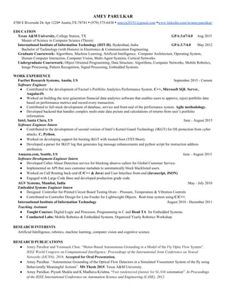 Amey Parulkar has a Master's degree in Computer Science from Texas A&M University and a Bachelor's degree in Electronics and Communication Engineering from IIIT-H, India. He has over 5 years of experience as a Software Engineer at FactSet Research Systems, where he contributes to developing financial data analytics software. His research interests include artificial intelligence, robotics, machine learning, and computer vision. He has published papers in these areas and worked on various projects applying these technologies.