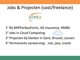 (vast/freelance)1° Bij BNPParibasFortis, AG Insurance, NMBS2° Jobs in Cloud Computing3° Projecten bij klanten in Gent, Brussel, Leuven4° Permanente aanwerving : .net, java, oracle2
