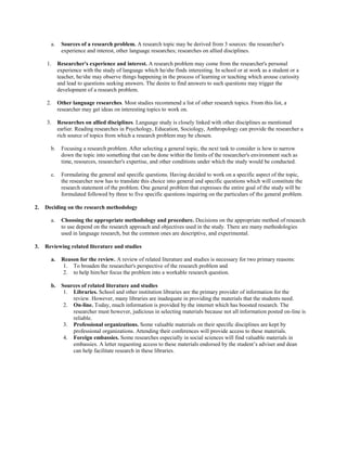 Language research is a complex process that requires consideration of many factors such as language use, type of users, acquisition process, setting, and related disciplines. There are four key parameters in the framework of language research: approaches, objectives, research design, and data collection/analysis. Some preparatory stages of language research include selecting and focusing on a research problem by considering sources of topics from one's experience, other language research, and allied disciplines. The researcher then decides on an appropriate methodology and reviews related literature and studies to broaden their perspective and focus the research question.