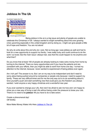 The document discusses being jobless in the UK and provides encouragement for those struggling. It notes that many people will be unable to fully enjoy Christmas due to being unemployed. It then shares the author's experience of once being jobless and turning to the internet to find opportunities to support their family and gain independence. The author believes the internet can provide a way for people to make extra money and potentially work from home, avoiding the risk of being jobless. The author wishes readers a happy Christmas and new year and encourages anyone interested in changing their life situation to ask about new ways of living without the pressure of losing their job.