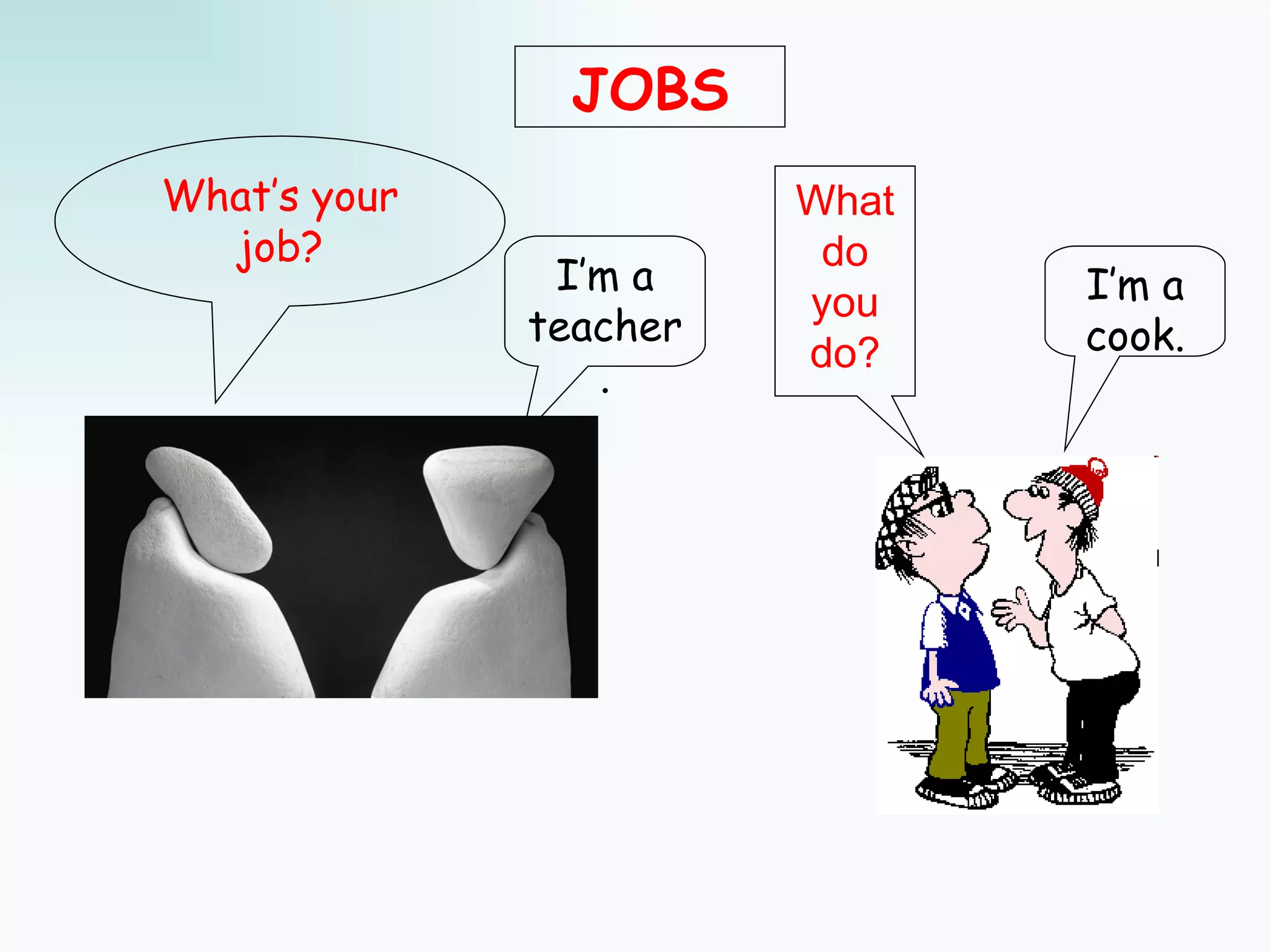 The document discusses common patterns used to describe jobs or professions in English. These include using the verb with the suffix "-er" like "teach-teacher", the verb with "-or" like "sail-sailor", a noun with "-ist" like "piano-pianist", a noun with "-cian" like "electricity-electrician", and a noun with "-man" or "-woman" like "police-policeman". It also provides some examples of common jobs that don't follow these patterns, such as "cook", "astronaut", and "nurse".