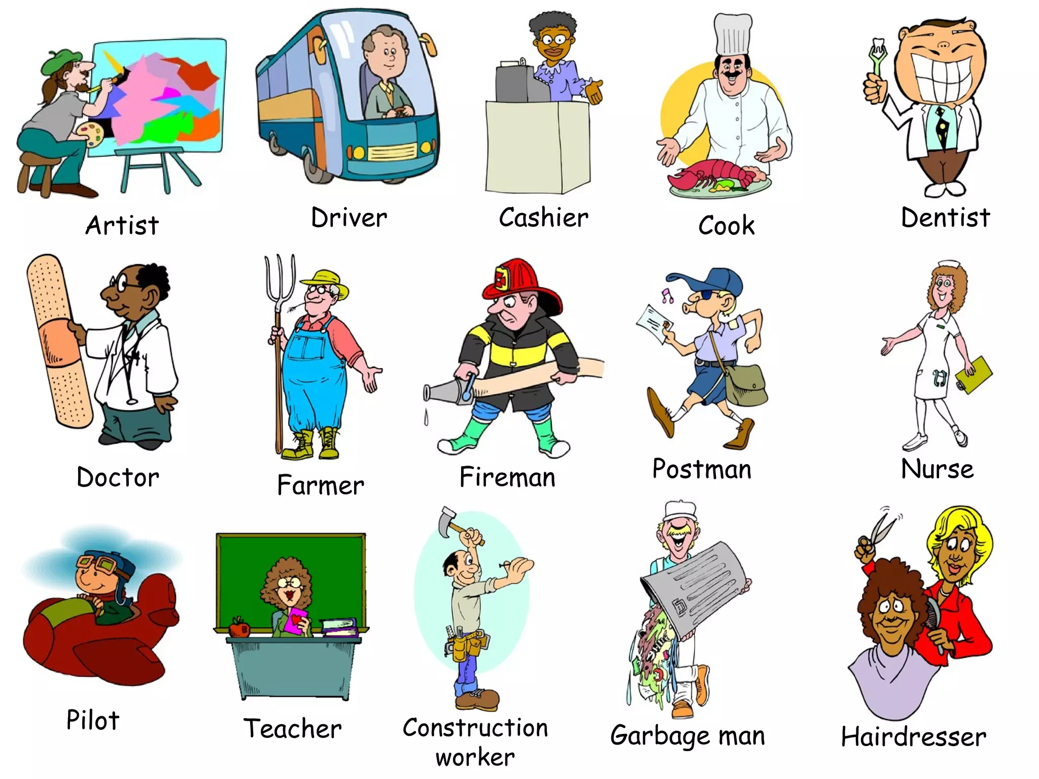 This document lists various occupations including artist, doctor, pilot, driver, farmer, teacher, cashier, fireman, construction worker, cook, postman, garbage man, dentist, nurse, hairdresser, photographer, policeman, waitress, plumber, dancers, musician, scientist, lawyer, secretary, waiter, vet, and computer programmer.