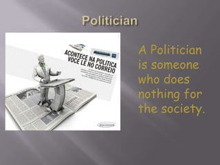A politician does nothing for society, a motorcycle rider races motorcycles, and a journalist writes news for newspapers. An agronomist engineers land and a kindergarten teacher cares for young children. The document was written by Agostinho Oliveira No. 1.