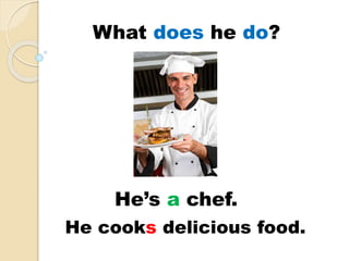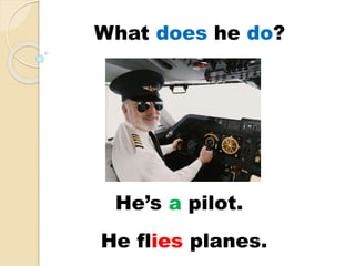 The document describes various occupations including pilot, chef, waiter, bus driver, secretary, student, dentist, farmer, sales clerk, nurse, doctor, journalist, lawyer, architect, engineer, and actor. For each occupation, it states what the person is (e.g. "He's a pilot") and provides a brief description of their duties, before asking "What does he/she do?".