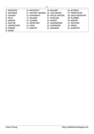 This document provides instructions for a word search puzzle. It contains a grid of letters with 33 hidden words from different occupations listed at the bottom that are hidden horizontally, vertically, or diagonally in the grid. The goal is to locate each word in the grid and circle it.