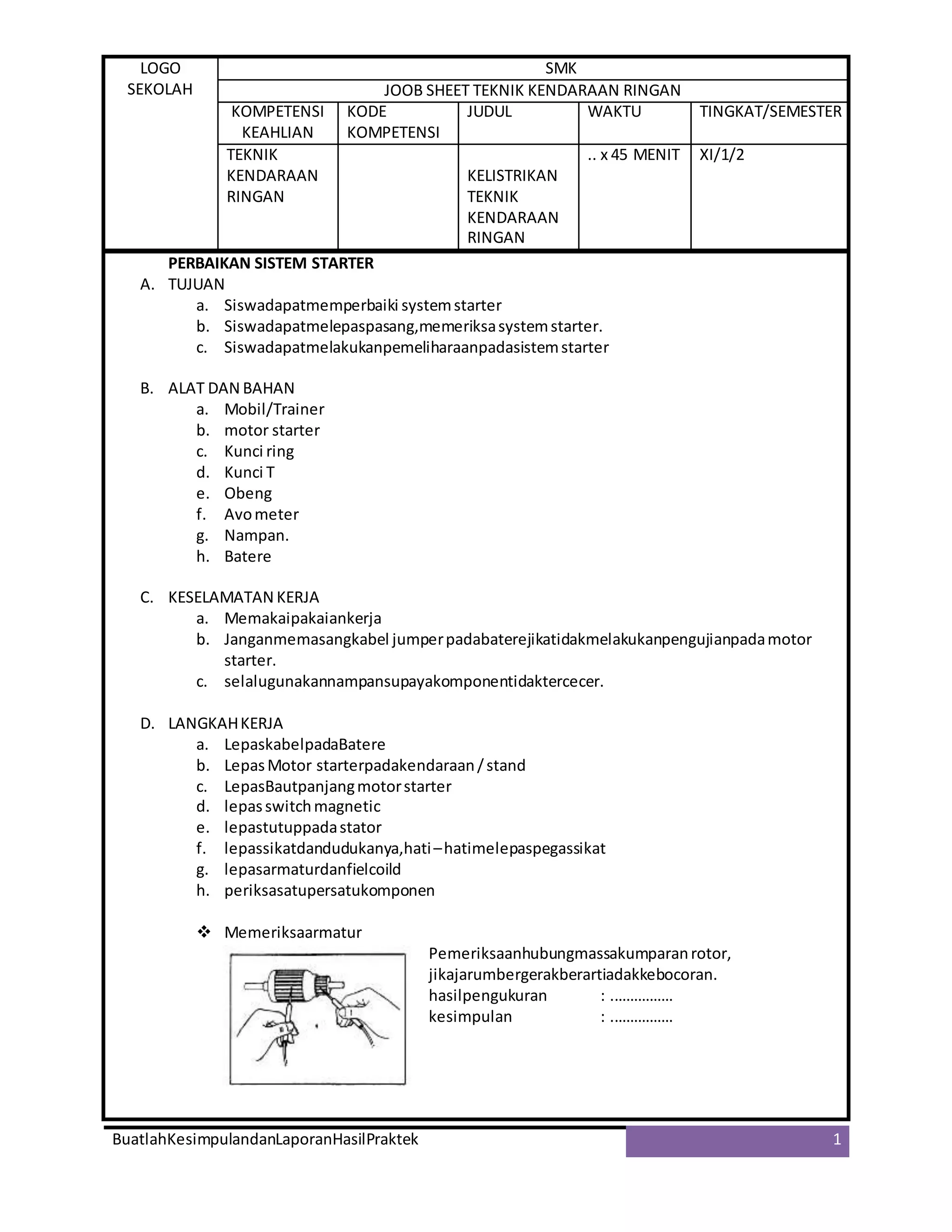Dokumen tersebut memberikan instruksi langkah-langkah perbaikan sistem starter pada kendaraan ringan, meliputi tujuan, alat dan bahan, keselamatan kerja, langkah kerja, dan pengujian komponen sistem starter. Langkah-langkah tersebut meliputi pemeriksaan dan perbaikan komponen sistem starter seperti armatur, rotor, sikat karbon, dan uji coba fungsi pull in coil, hold in coil, dan uji beban.
