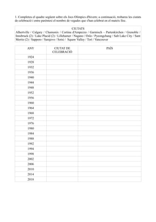 1. Completeu elquadre següent sobre els Jocs Olímpics d'hivern; a continuació, trobareu les ciutats