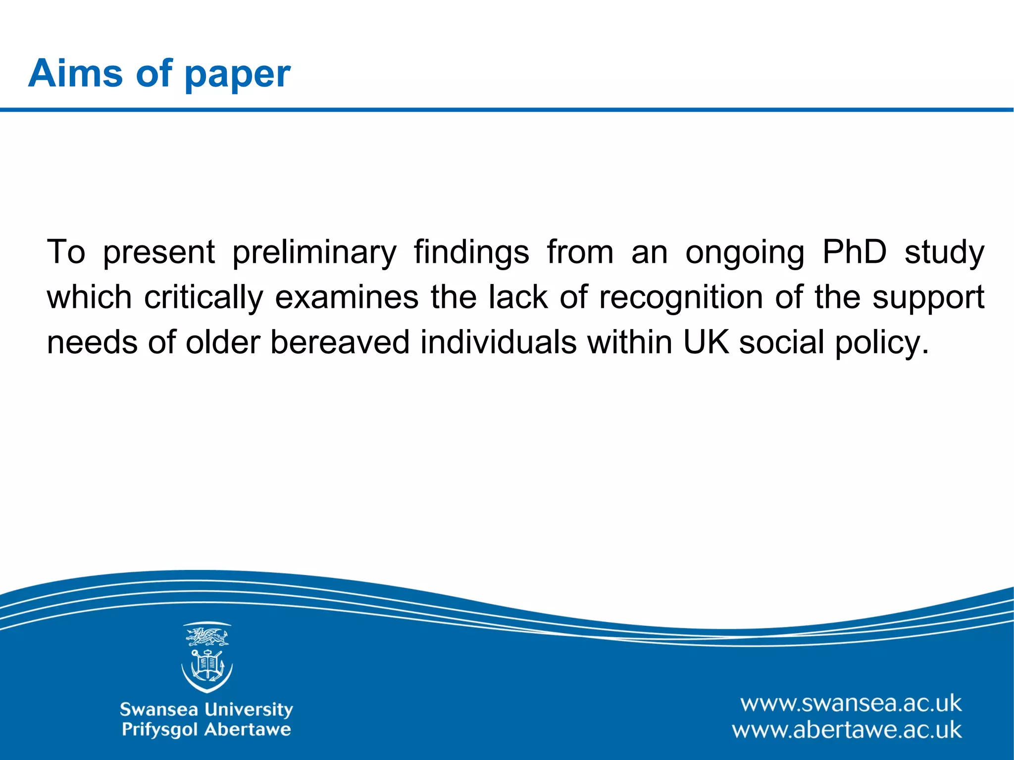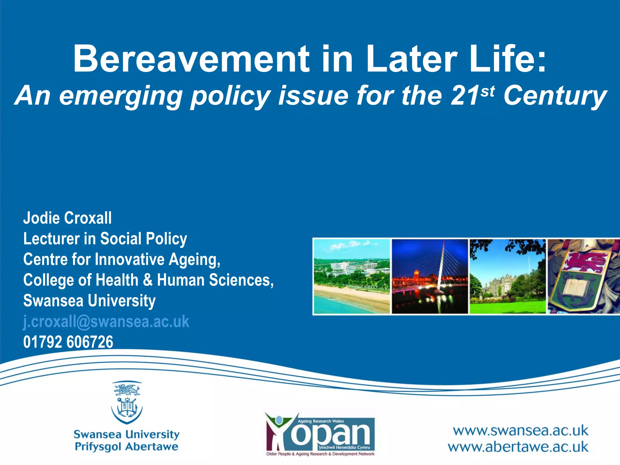 The document discusses the lack of recognition and support for older individuals experiencing bereavement within UK social policy. It highlights the need for a shift in perception to treat bereavement as a public issue rather than a personal one, emphasizing the unique challenges faced by this demographic. Findings from qualitative interviews reveal significant unmet support needs and call for more coordinated formal support systems to address these challenges.