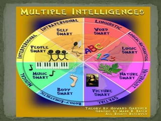 The document discusses teaching students with varying abilities and backgrounds. It emphasizes recognizing each student's individual strengths and needs to maximize their growth. It promotes using multiple methods of teaching, including linguistic, logical-mathematical, spatial, bodily-kinesthetic, musical, interpersonal, intrapersonal, and naturalist approaches. Some examples provided are class discussions, hands-on activities, movement, artwork, music, self-reflection, and outdoor experiences. The goal is to engage all students through their diverse intelligences and ways of learning.