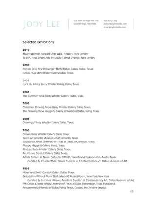 This document lists the exhibitions, publications, collections, teaching experience, grants, education, and other professional activities of an artist. It includes solo and group exhibitions from 1999 to 2010 in Texas and New York. Publications about the artist date from 1999 to 2009. The artist's work is in the collections of American Airlines and the Art Pace Foundation. They have taught at the Modern Art Museum of Fort Worth and Southern Methodist University and received grants from the Dallas Museum of Art. Their education includes degrees from Reed College, the University of Washington, and Southern Methodist University.