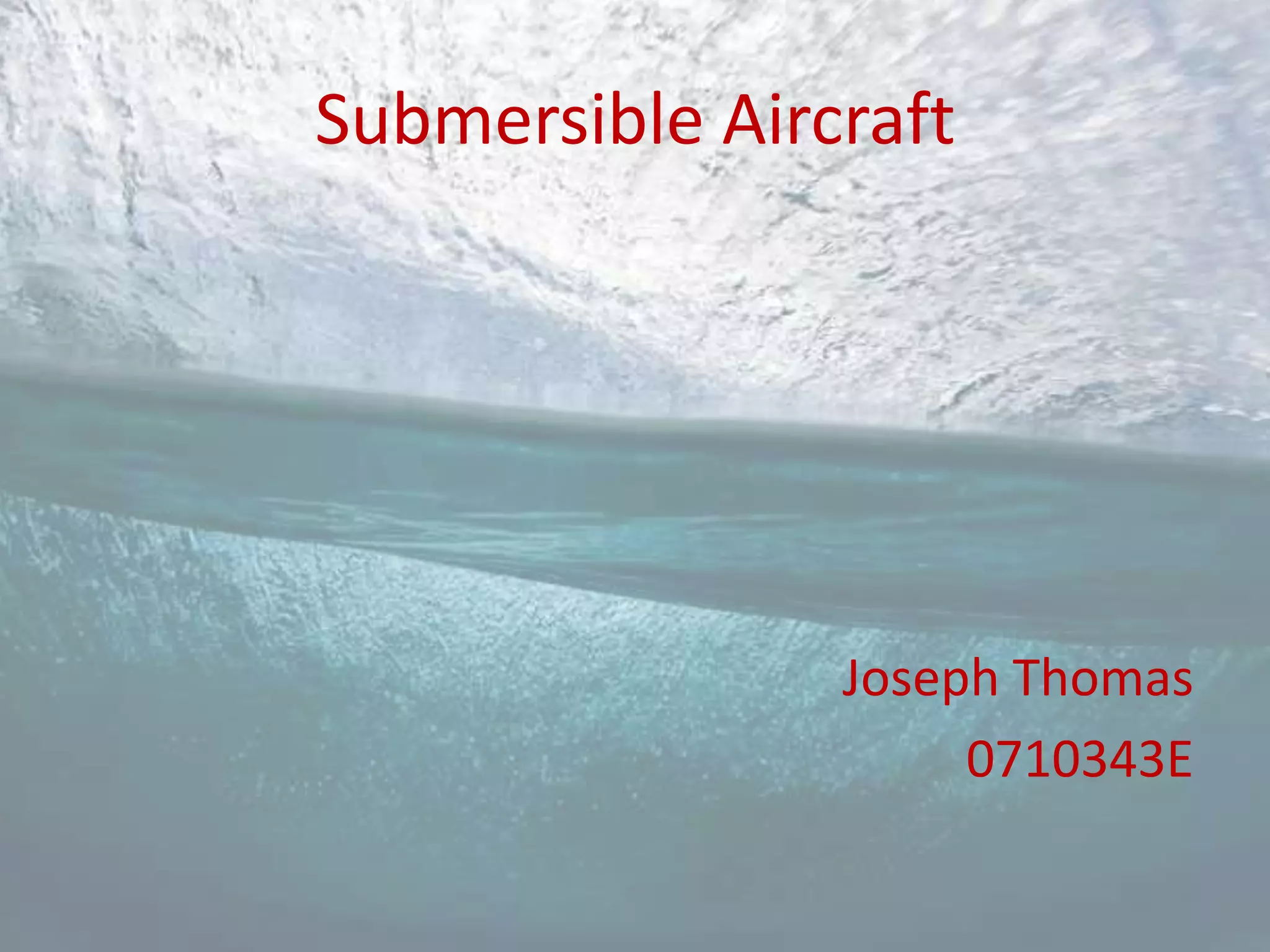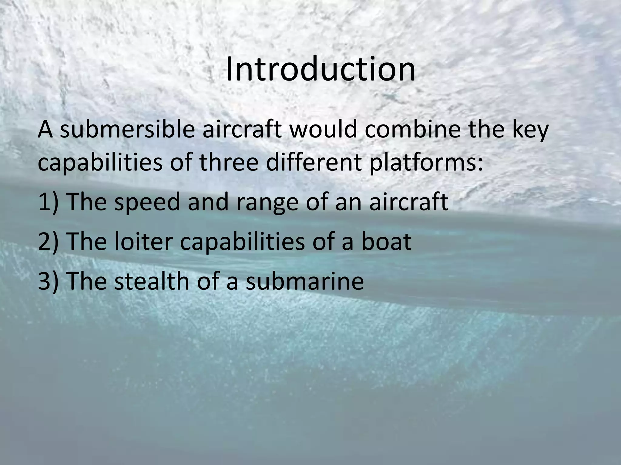 The document proposes a concept for a submersible aircraft that can take off and land on both land and water. It discusses three conceptual designs, considering advantages and disadvantages of each. Key specifications of engines, components, and performance are estimated. Mission profiles involving takeoff from land, cruise, and landing on water are described. Design challenges like drag underwater and on takeoff are analyzed.