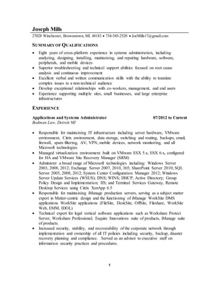 Joseph Mills is an experienced systems administrator seeking a new position. He has over 8 years of experience administering systems across multiple platforms. Currently, he maintains the IT infrastructure, including servers, storage, and security, for a large law firm. Previously, he administered systems for ProQuest and provided IT support for multiple small businesses. He has various technical certifications and a bachelor's degree in information technology.
