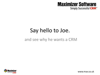 Joe runs a small business and needs help managing customer relationships, contacts, and tasks. He is overwhelmed with the amount of information he needs to track across different channels and formats. A CRM system could help Joe stay organized, access information easily, and focus on growing his business instead of administrative tasks. The document advertises how a Maximizer CRM could provide Joe with a centralized system to manage all of his customer data and communications.