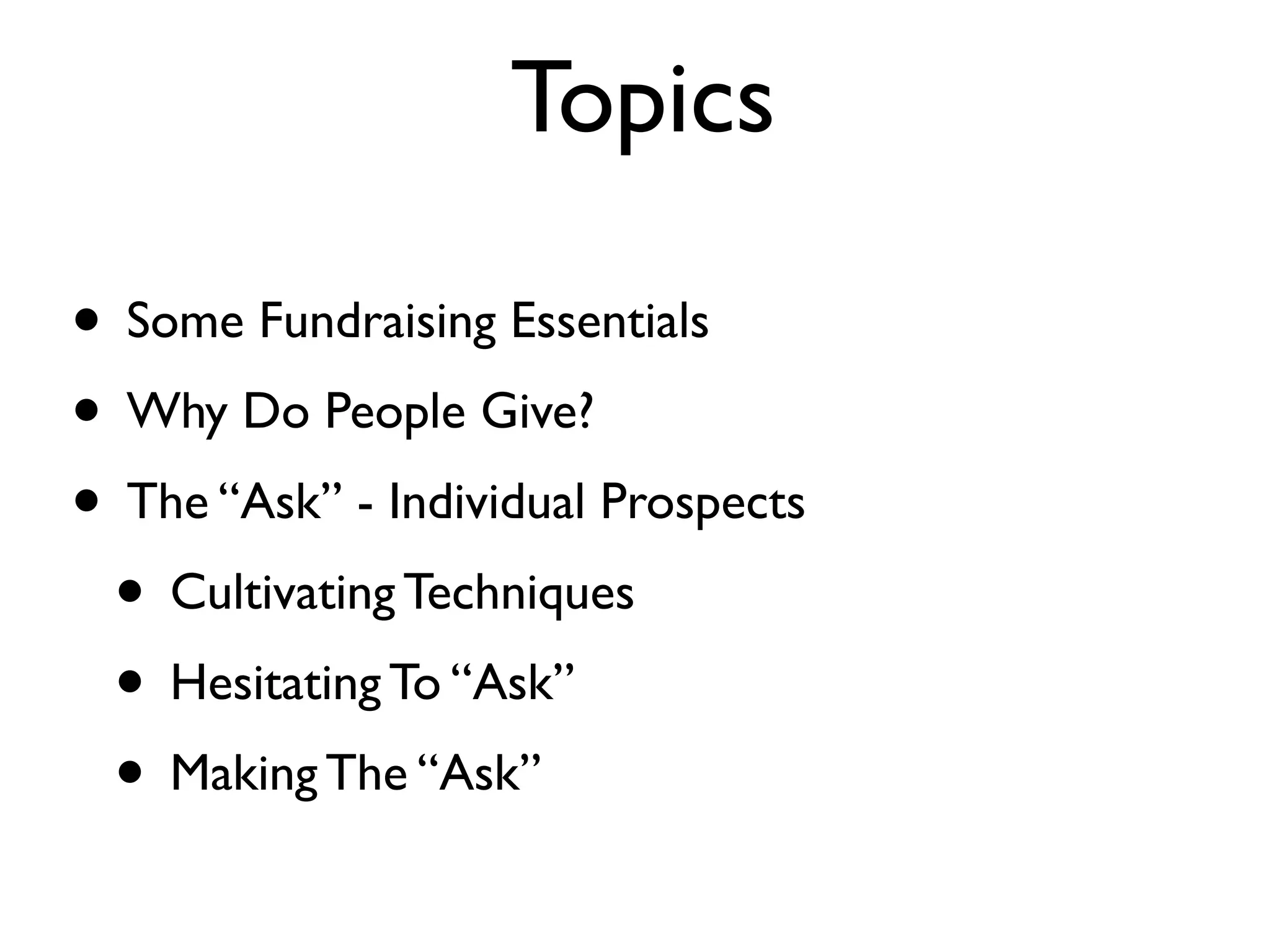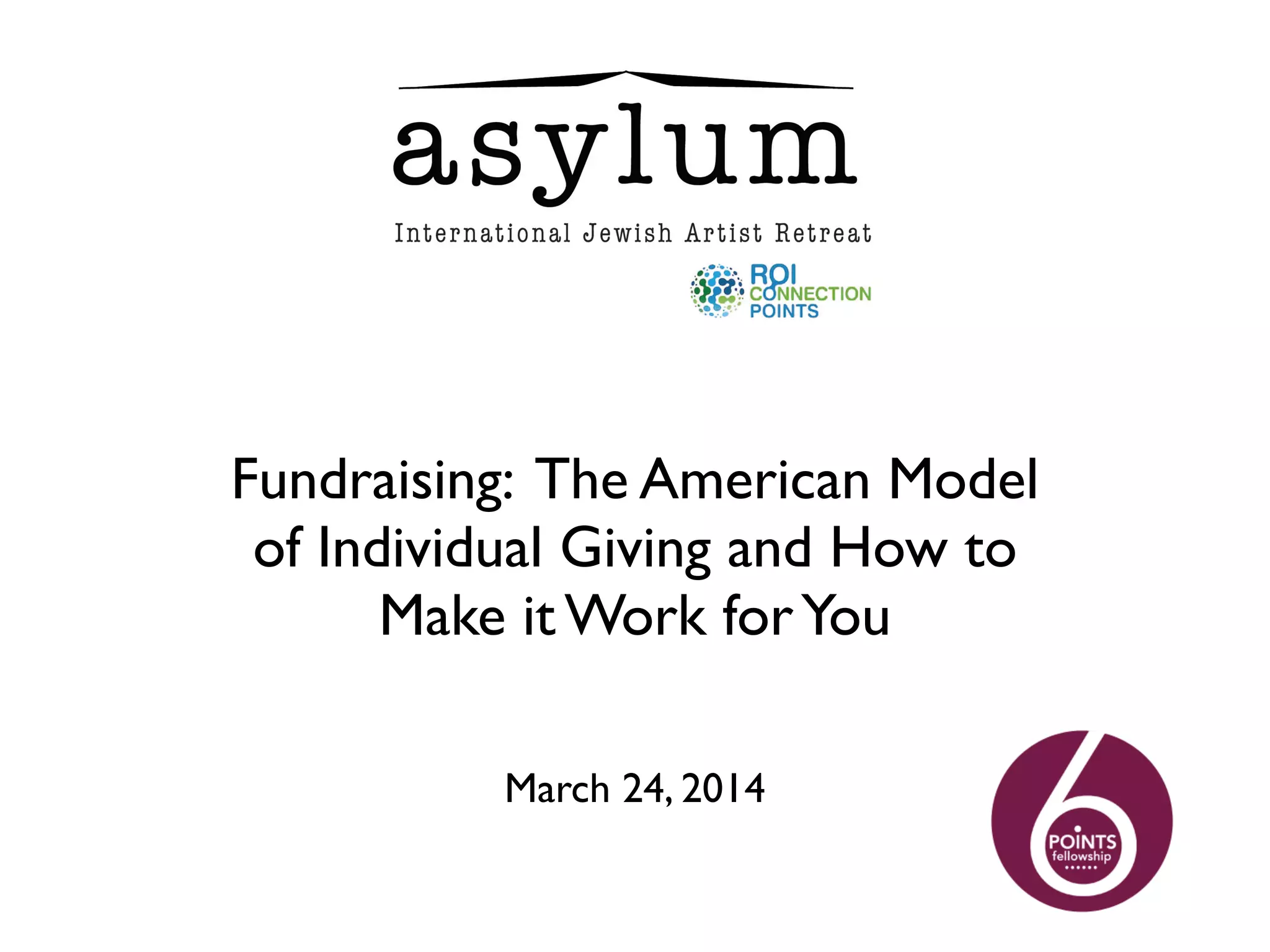 This document provides guidance on fundraising using the American model of individual giving. It discusses why people give, cultivating donors, and how to make an effective "ask." Some key points include: