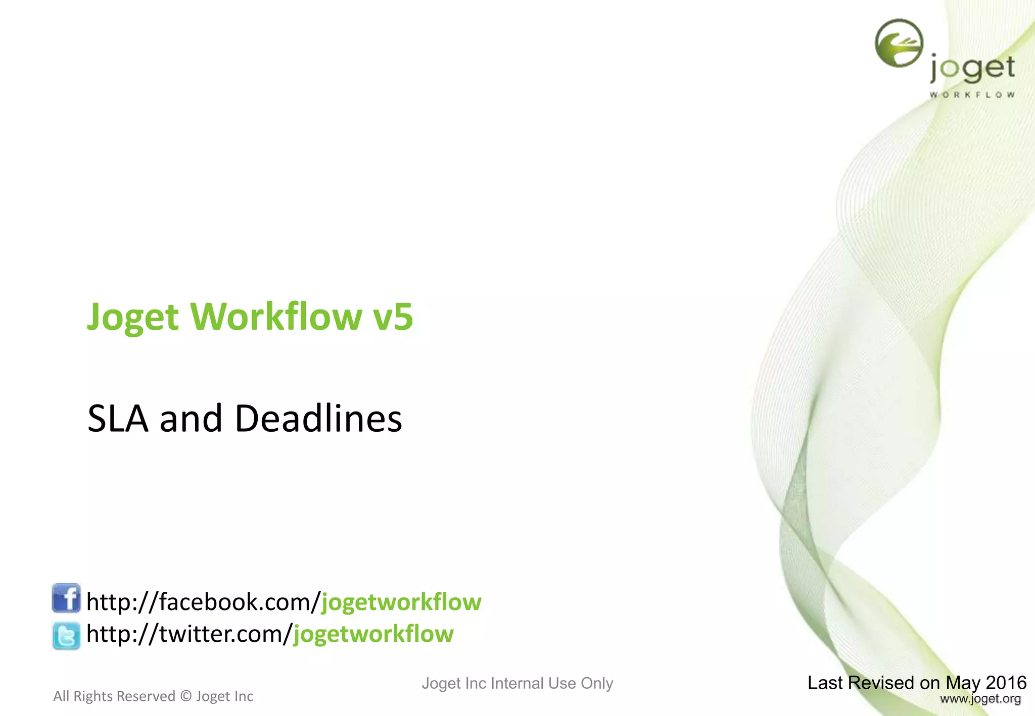 This document discusses service level agreements (SLAs), deadlines, and deadline plugins in Joget Workflow. It provides instructions on how to set SLA limits on workflow activities to define service levels. It also explains how to set deadlines on activities and exceptions on transitions to implement deadline-based workflow. Finally, it introduces deadline plugins that can influence how SLAs and deadlines are calculated based on factors like holidays and work hours.