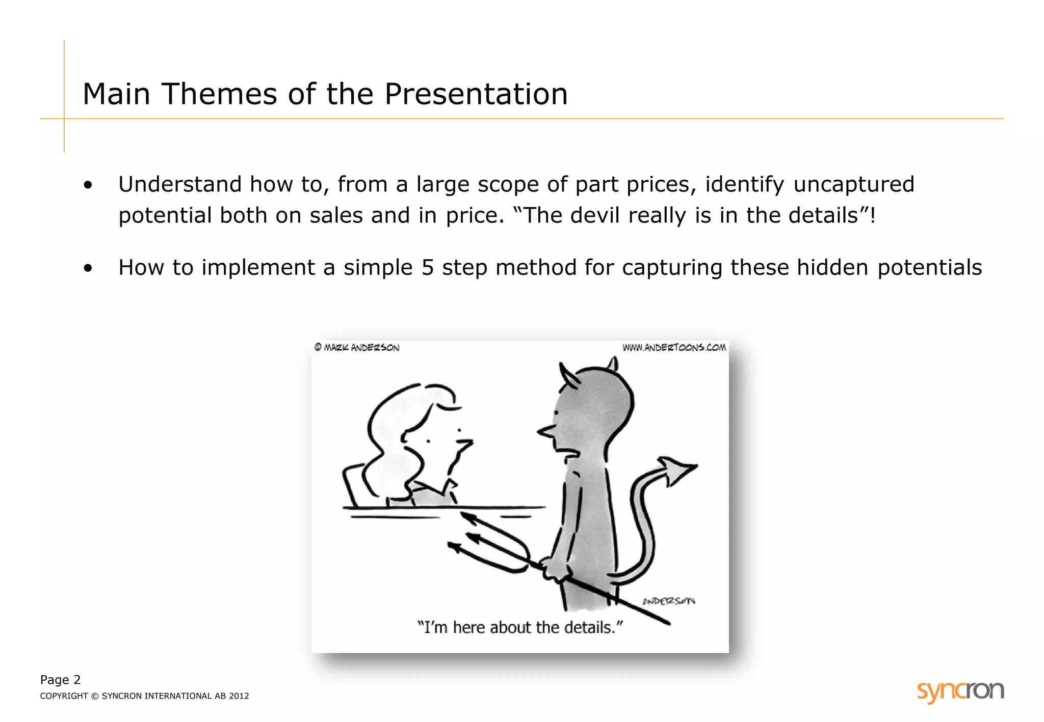 The document discusses identifying and capturing hidden profit potential in spare part businesses through a detailed pricing analysis. It outlines a five-step method that includes evaluating list prices, assessing discounts, analyzing customer spending profiles, and reviewing costs to optimize pricing strategies. The emphasis is on understanding various value drivers and implementing data-driven decisions for improved profitability.