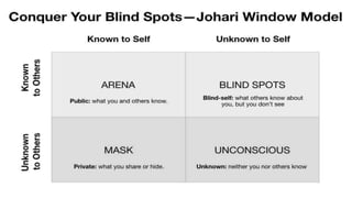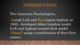 The document discusses the Johari window model, which was developed in 1955 by American psychologists Joseph Luft and Harrington Ingham. The model helps people understand their relationship with themselves and others through four regions or "panes" of self-knowledge: open self (known to self and others), blind self (unknown to self but known to others), hidden self (known to self but unknown to others), and unknown self (unknown to self and others). The goal of the model is to increase open self-knowledge through self-disclosure and feedback from others, while decreasing the size of the other regions.