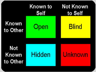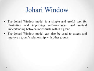 This document provides an overview of the Johari Window model, which is used to illustrate self-awareness and understanding between individuals and groups. It describes the four regions or areas of the model: 1) open/free area known to self and others, 2) blind area known to others but not self, 3) hidden area known to self but not others, and 4) unknown area unknown to self and others. The goal is to increase the open area through feedback and disclosure to improve communication, relationships, and group dynamics. The model was created in 1955 by psychologists Joseph Luft and Harry Ingham to study group interactions.