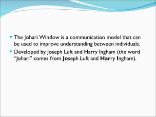 The Johari Window is a communication model developed by Joseph Luft and Harry Ingham that enhances understanding between individuals through self-awareness. It features four quadrants: open area, blind area, hidden area, and unknown area, which represent personal information known or unknown by the individual and others. The model promotes trust and effective teamwork by encouraging self-disclosure and feedback to increase the open area.