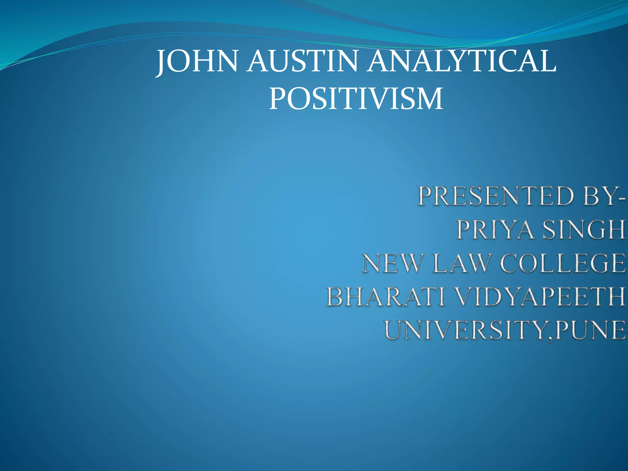John Austin is considered the father of analytical positivism. In his work Province of Jurisprudence Determined, he analyzed the English legal system and divided law into two parts - laws set by God and human laws set by men. According to Austin, law is the command of the sovereign, and there is no necessary connection between law and morality. Austin's theory views the legal system as a closed logical system defined by a sovereign, whose commands are backed by sanctions for disobedience. While influential, his theory overlooks customs and ignores precedent, and his notion of sovereignty has been challenged by modern legal systems.