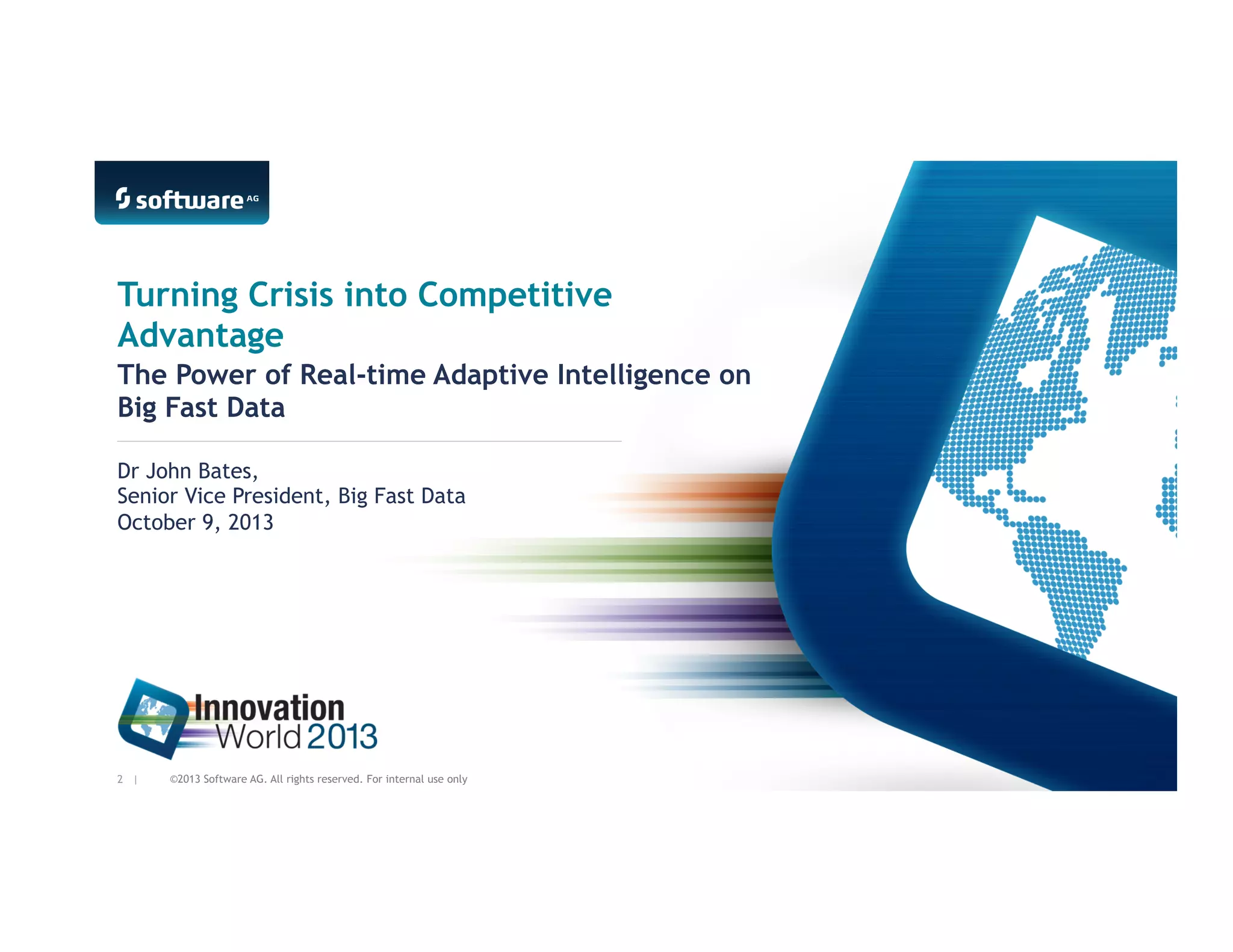 The document discusses the challenges posed by big fast data and the need for real-time adaptive intelligence. It notes that the time window to analyze and act on data is shrinking, and traditional batch-oriented business intelligence is no longer sufficient. Real-time analytics and embedded intelligence that can take immediate action are needed. Examples are provided where adaptive intelligence has helped companies address issues like suspicious trading, customer experience, and system performance. The document argues adaptive intelligence can help companies optimize operations, learn continuously and improve outcomes in real-time using big fast data from diverse sources.