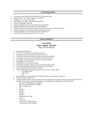 John Bustos provides his qualifications and experience as an engineer support specialist and business analyst. He has over 6 years of experience in desktop support, hardware troubleshooting, and working with technologies like Windows, SQL, and virtual machines. His experience also includes over 6 years analyzing business requirements, testing software, and implementing systems using methodologies like Agile and Waterfall. He is bilingual in English and Spanish and has a bachelor's degree in computer science.