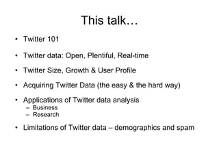 This document discusses applications of analyzing Twitter data for business and research purposes. It provides an overview of Twitter, including its size, growth, and user demographics. It then discusses how to acquire Twitter data through the Twitter search feature or Twitter APIs. Finally, it outlines several potential applications of Twitter data analysis, including social network modeling, predictive modeling for business, brand sentiment analysis, and limitations around demographics and spam.