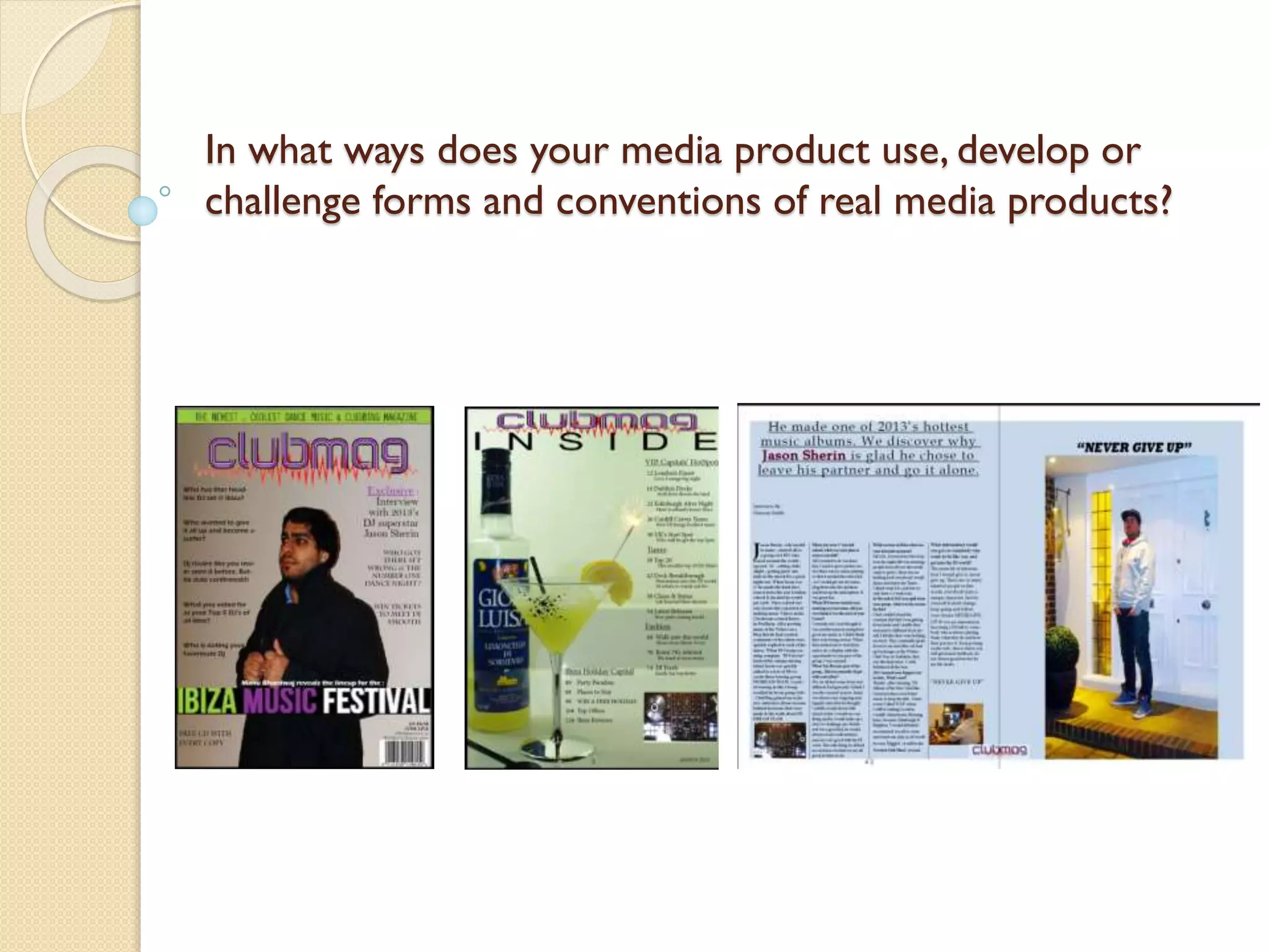 The document describes the key components and conventions used in the design of a music magazine called Clubmag. It discusses elements like the masthead, cover lines, brand identity, images, colors, typefaces, contents page, and double page spreads. The magazine's design follows conventions of real music magazines, such as having a masthead with the title, cover lines to entice readers, a consistent brand identity, eye-catching colors, varied typefaces, and balanced layouts with images and text. The document suggests the magazine's design is conventional and marketable to a wide music and nightlife audience.