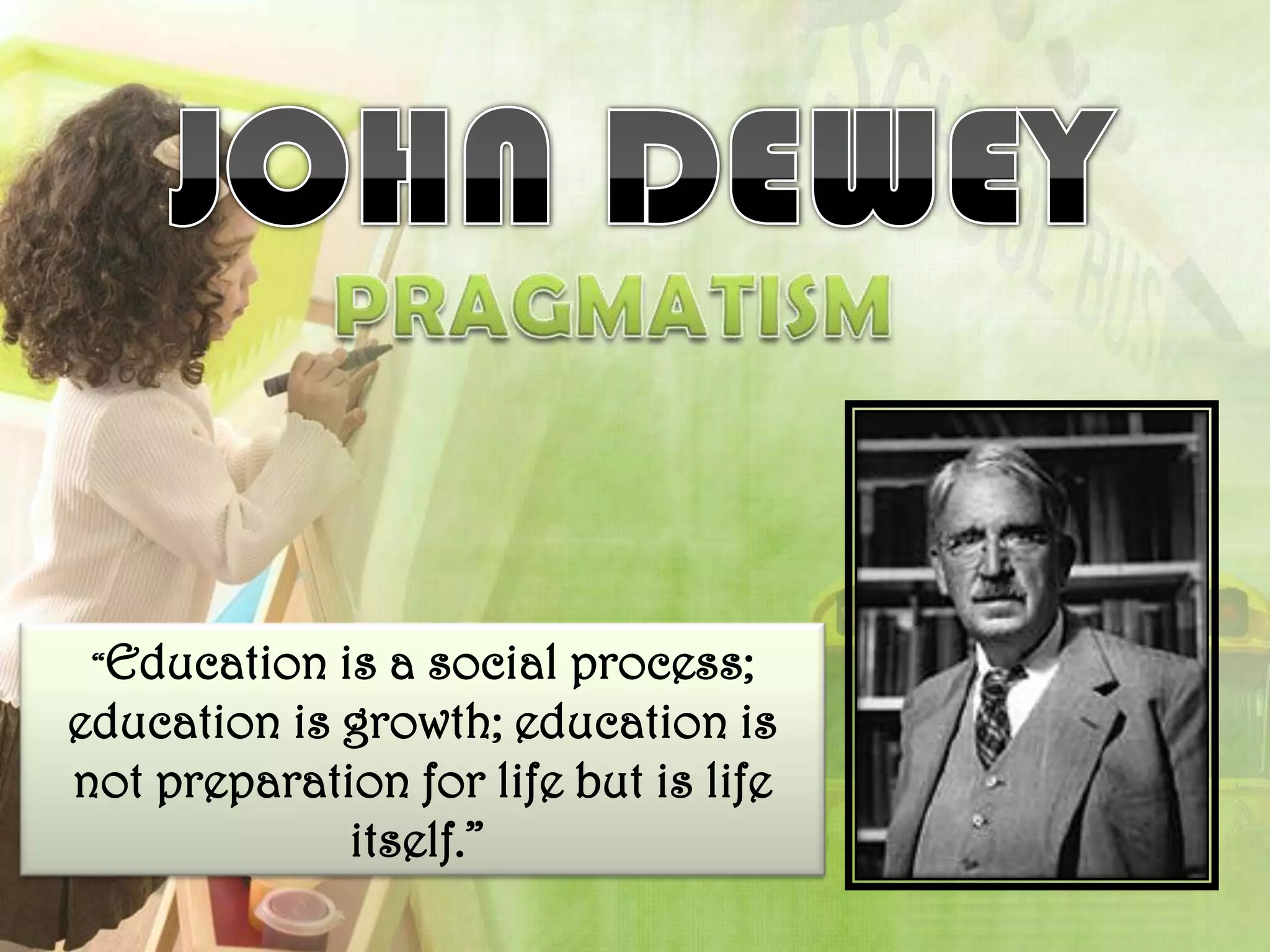 The document discusses John Dewey's views on education, which included that education is a social process and is life itself, not just preparation for life. Dewey believed students should be involved in real-life tasks and challenges to learn, and that education serves the broader social purpose of enabling citizens to contribute usefully to their culture and vocation in a democracy. His ideas emphasized learning through experience and interaction with the natural world, and influenced the development of progressive education models.