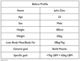 This document summarizes a person's weight loss and fitness journey over a 3 month period from January to April. It shows their starting weight of 65kg increasing to 79kg, with body fat decreasing from 11% to 15% and lean body mass increasing from 55kg to 67kg. Brief notes describe initially feeling more energy and later seeing physical changes, with a goal of increasing lean body mass by 7kg being exceeded. Diet involved a paleo approach with milk consumption to build muscle at first, later adding 2 days of fasting per week. Exercise included Starting Strength training, improving flexibility, CrossFit classes, and bodyweight exercises at home using a chinup bar and foam roller.