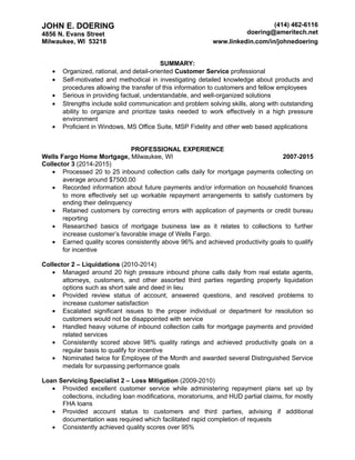 John Doering has over 15 years of experience in customer service roles, most recently working at Wells Fargo Home Mortgage as a Collector handling inbound calls regarding mortgage payments and loss mitigation options. He has a track record of consistently high performance ratings and achieving productivity goals. Doering is skilled in problem solving, communication, and organizing tasks in high-pressure environments. He holds a Bachelor's degree in Business Administration with a focus on Marketing.