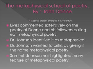 A group of 17th century poets including Donne were later referred to as metaphysical poets. Dr. Johnson identified their poetry as metaphysical and wanted to criticize it by giving it this label. Their poetry was characterized by the use of learning and far-fetched images/conceits, making their poetry difficult for readers, in an attempt to showcase their intelligence through non-traditional poetic styles. The metaphysical school of poetry declined after the Restoration in 1660.
