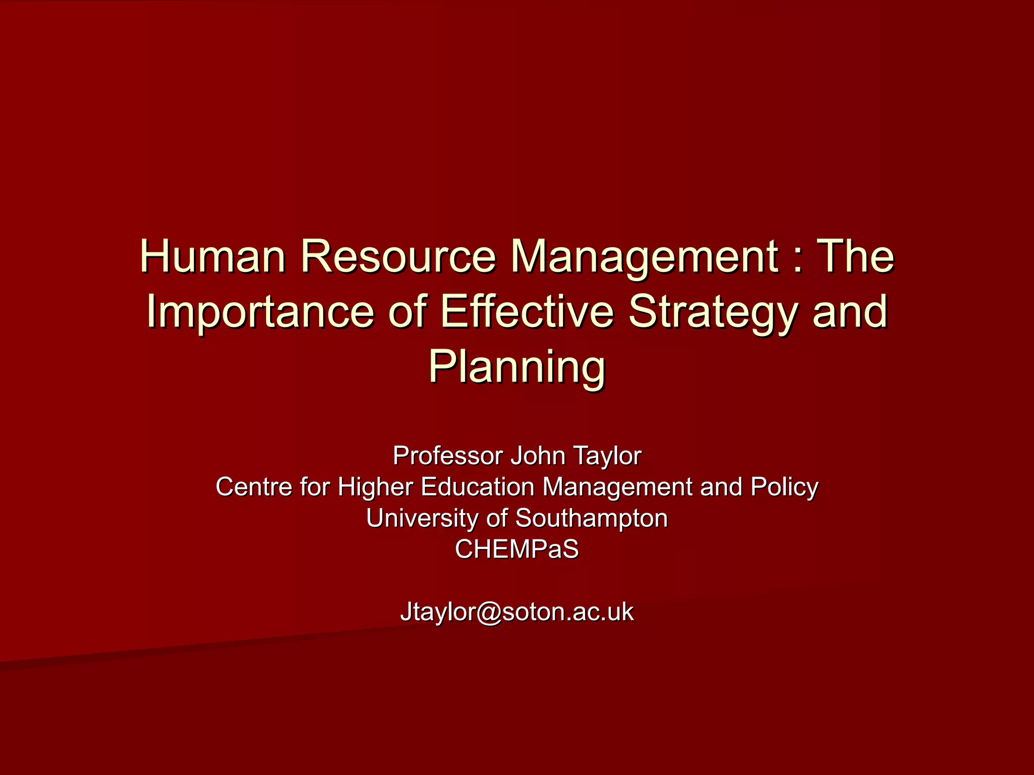 This document discusses the importance of strategic human resource planning in higher education institutions. It outlines key challenges facing higher education like increased competition and reduced funding. Effective HR planning is needed to address these challenges by understanding the external environment, reviewing current performance, and linking HR strategies to institutional goals. The HR strategy should have clear targets and monitor progress to recruit, develop, and retain high-quality staff through initiatives like training, performance reviews, and equal opportunity programs. Professional services staff also require career development to efficiently support the institution's operations.