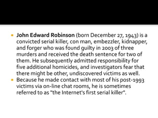 John Edward Robinson is a convicted serial killer who was found guilty of murdering 3 women and received the death penalty for two of the murders. He has since admitted to killing 5 additional women and meeting most of his victims through online chat rooms, earning him the nickname "the Internet's first serial killer". Robinson has a long history of fraud, embezzlement, forgery and has been incarcerated multiple times for these crimes. He would gain his victims' trust by promising them jobs or relationships before killing them. Robinson was finally arrested in 2000 after the remains of 5 women were found in chemical drums on his property and in a storage unit he rented, leading to his conviction.
