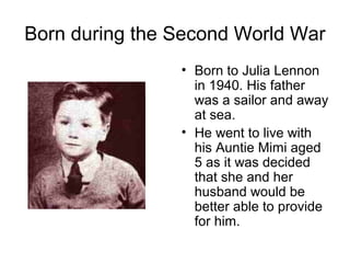 John Lennon was born in 1940 in Liverpool and formed his first band, The Quarrymen, in 1956. He went on to international fame as one of The Beatles in the 1960s, writing songs with Paul McCartney. Lennon left The Beatles in 1969 and married Yoko Ono, becoming actively involved in peace movements and political causes. On December 8, 1980, Lennon was fatally shot outside his New York City apartment building at age 40.