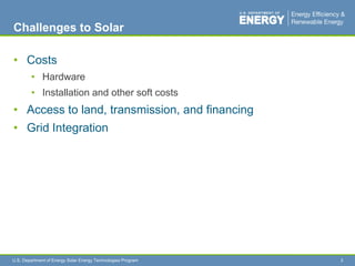 The document discusses the technical, economic, and environmental feasibility of achieving 10-20% of electricity demand from solar energy technologies by 2030, identifying key challenges such as costs, access to land, and grid integration. It outlines the solar energy cost targets and effectiveness of policy incentives, particularly for residential and utility-scale photovoltaics (PV) and concentrated solar power (CSP). Additionally, it highlights the need for advancements in infrastructure and financing strategies to enable high penetration of solar energy in the U.S. electricity system.