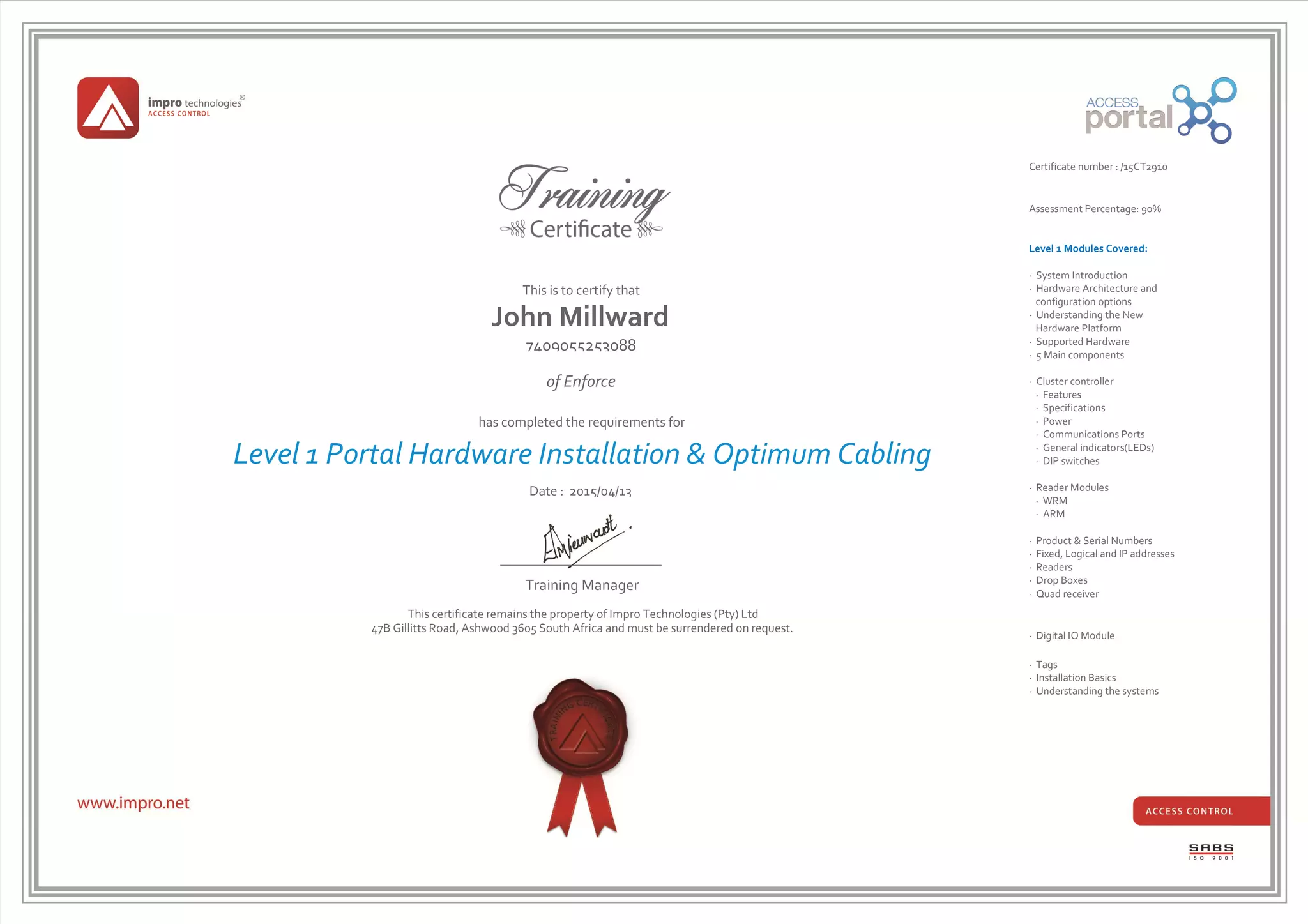 This certificate certifies that John Millward of Enforce completed training in Level 1 Portal Hardware Installation and Optimum Cabling on April 13, 2015, achieving a score of 90%. The training covered the hardware architecture, components, installation, and configuration of an access control system, including cluster controllers, reader modules, readers, tags and basic cabling. This certificate is the property of Impro Technologies and must be returned upon request.