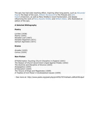 John Milton was born in London in 1608 and was educated at Cambridge, where he began writing poetry. After university, he spent six years studying independently at his family's country home. During this period, he composed several poems. In 1638, Milton took a tour of France and Italy, meeting influential figures like Galileo. He served in Oliver Cromwell's government during the English Civil War, losing his eyesight by 1651. Milton's masterwork, Paradise Lost, was published in 1667 and is considered one of the greatest epic poems in English literature. It had a profound influence on later writers like Alexander Pope and William Wordsworth.