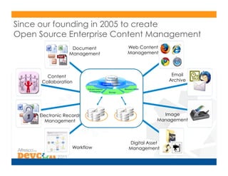 Alfresco is an open source enterprise content management company that has experienced significant growth since its founding in 2005. It now has over 550 enterprise customers, 70 new employees, and 3.4 million community downloads worldwide. The company has achieved 22 consecutive quarters of year-over-year growth and over $125 million in cumulative sales across 54 countries. Alfresco's CEO outlined its continued focus on customers, partners, marketing, and development as it works toward an IPO within the next two years.