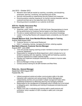 John Hamilton has over 20 years of retail management experience driving sales and providing excellent customer service. He has held various leadership roles in retail stores, call centers, and as a brand ambassador for pet food companies. His accomplishments include customer service awards and strong sales performance. He is dedicated, results-driven, and motivates teams to produce high performance.