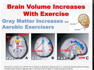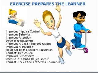 The document discusses the importance of physical activity for brain development and academic performance based on evidence from studies. It summarizes that early humans needed exercise for survival, exercise increases BDNF which promotes brain growth and plasticity, and several studies have shown correlations between increased physical fitness/activity and improved cognitive abilities, test scores, behavior, and attendance.