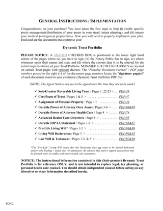 This document summarizes John Sample-Demo's Dynamic Trust Portfolio, which includes a revocable living trust, powers of attorney, living will, and other documents to manage his assets and medical decisions. The portfolio is designed to protect John's assets from unnecessary expenses during his lifetime and when transferring assets after death, while allowing him to maintain control. The summary provides explanations of each document and section to help John implement and fund the trust properly. It also serves as a reference for his successor trustee.