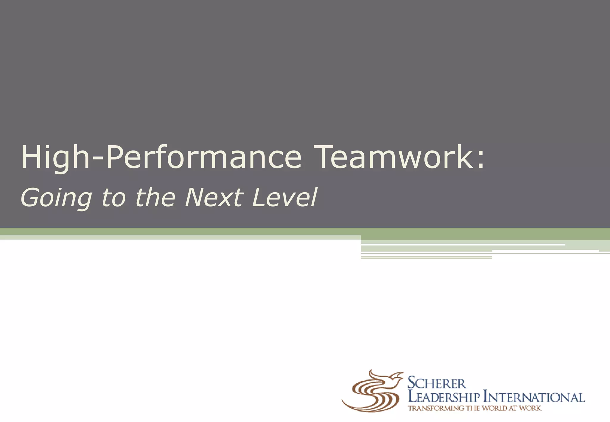 This document discusses the characteristics of high-performance teams and provides guidance on developing them. It begins with an overview of the typical life cycle stages of organizations from embryonic growth to decline. It then outlines eight key characteristics of high-performance teams: having a clear shared purpose; fostering frank discussions; valuing differences of opinion; the leader working for consensus; designating individuals accountable for decisions; welcoming diverse individual skills; looking for value in novel ideas; and regularly reflecting on performance. The document provides tips and tools for applying these characteristics, such as using polarity management and understanding different workplace communication styles.