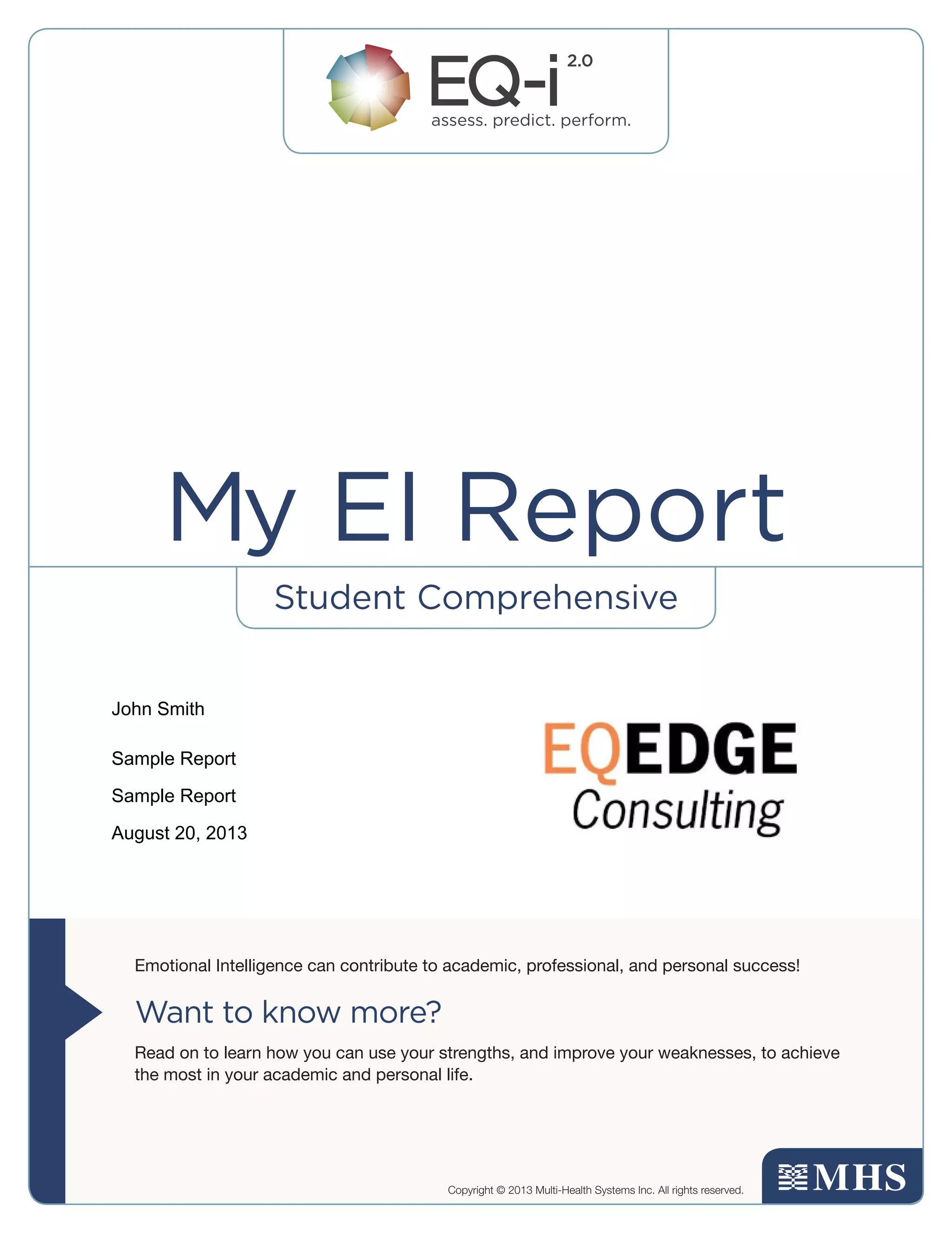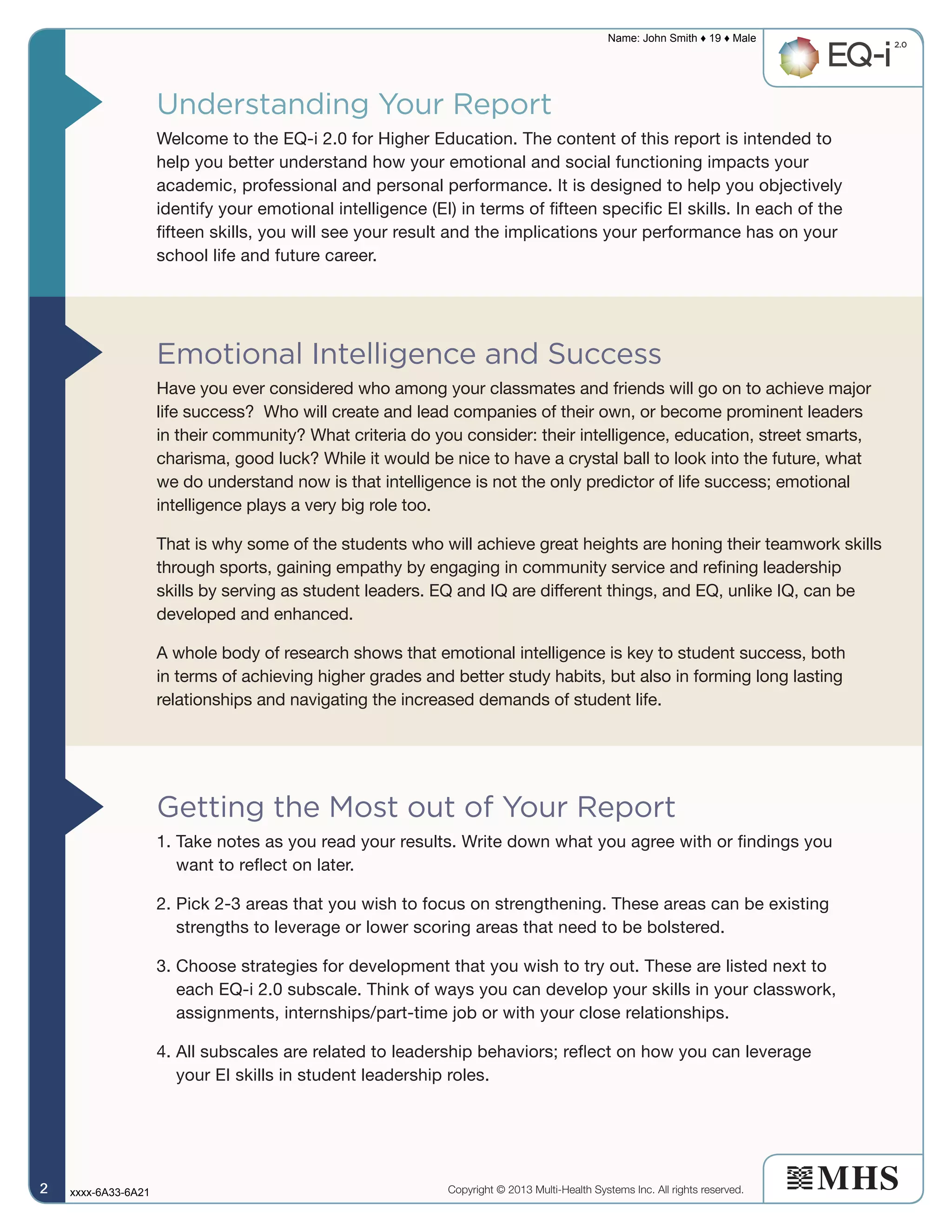 John Smith received an emotional intelligence report. The report showed that he has strengths in self-regard, self-actualization, and emotional expression. It recommends that he seek feedback to further develop himself by leveraging his strengths and improving on his limitations. The report also notes that his drive to improve himself can help him succeed academically and professionally.