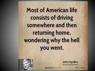 John Updike was an influential American novelist, poet and literary critic. He is best known for his "Rabbit" series chronicling the life of Harry "Rabbit" Angstrom. Updike published over 60 books in his lifetime and was awarded two Pulitzer Prizes. His writing focused on themes of religion, sex, marriage and death through vivid prose and complex characters. The "Rabbit" novels, which follow Rabbit from young adulthood to late life, exemplify Updike's skill in capturing the spiritual and cultural issues of the American middle class.