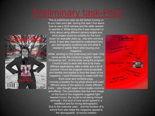 The document summarizes John Wilding's preliminary and final print tasks for a school assignment. For the preliminary task, John learned how to use an SLR camera and the Photoshop software. He considered camera angles and his target demographic. For the final task, John researched music magazines to design one for an indie music genre targeting teenagers. He organized a photoshoot and used Photoshop to edit the photos and design the magazine layout. Overall, John gained experience with photography, design software, targeting audiences, and the magazine production process.