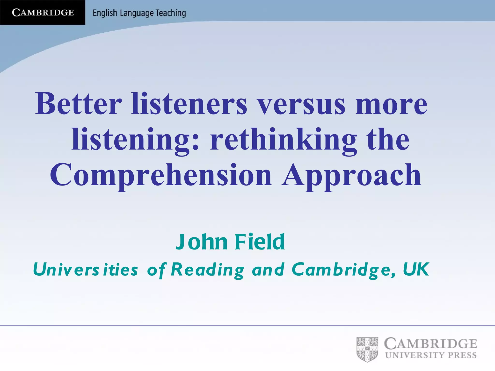 The document proposes a process approach to teaching listening that focuses on the underlying skills and strategies involved in listening rather than just testing comprehension. It discusses 3 key aspects: 1) Understanding the challenges of the listening input. 2) Modeling the processes used by expert listeners. 3) Enabling learners to develop strategies to cope with unfamiliar language through focused practice of subskills. The goal is to train learners to become better listeners by practicing underlying skills rather than just testing comprehension.