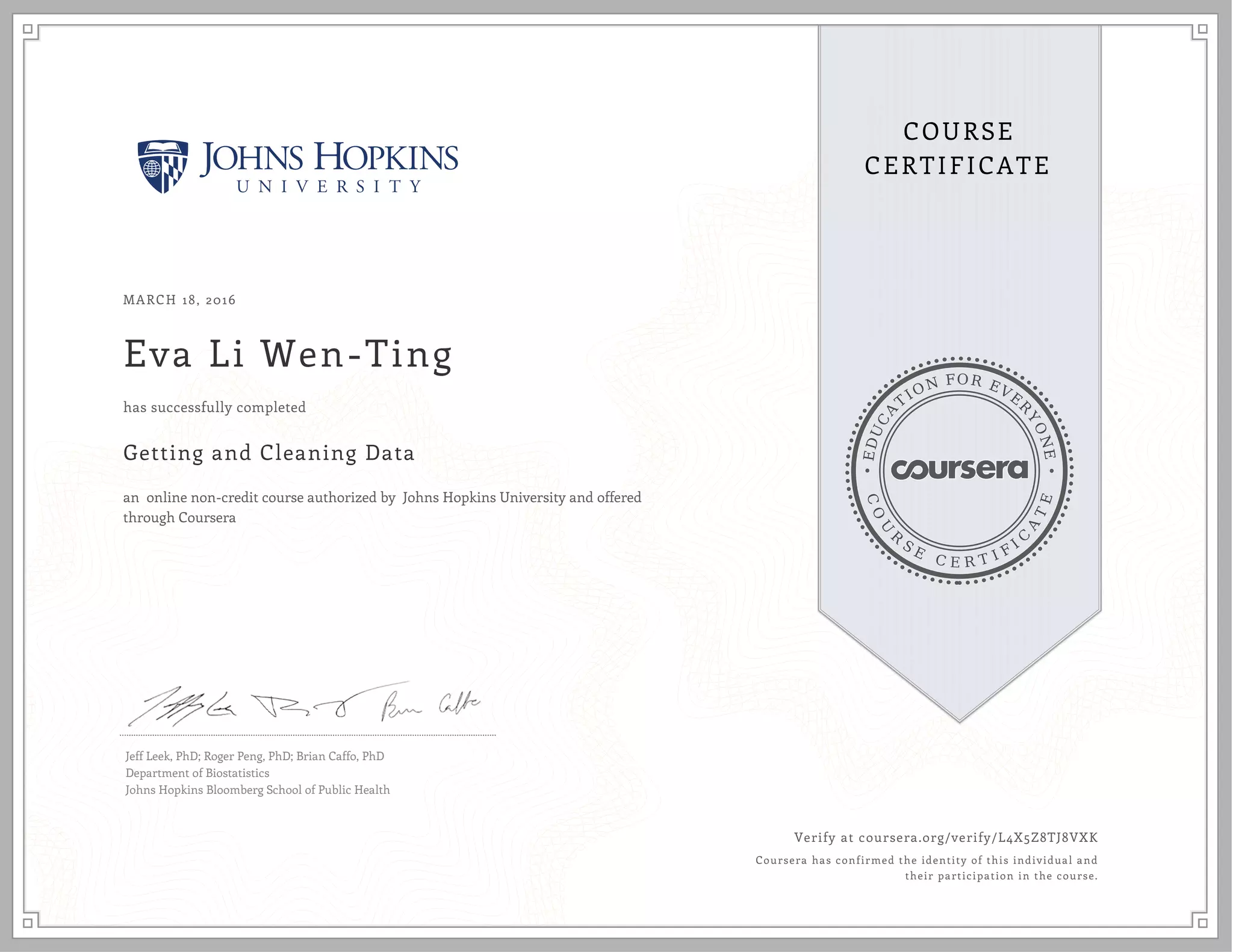 Eva Li Wen-Ting successfully completed an online non-credit course called "Getting and Cleaning Data" offered through Coursera and authorized by Johns Hopkins University. The course was taught by Jeff Leek, Roger Peng, and Brian Caffo from the Department of Biostatistics at the Johns Hopkins Bloomberg School of Public Health, and Eva received a course certificate dated March 18, 2016 to verify her participation and completion of the course.