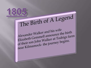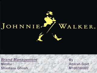 The document summarizes the history and evolution of Johnnie Walker whisky brand over 200 years, from its origins in Kilmamock, Scotland in 1820 when John Walker opened a grocery shop, to its growth into a global brand under his son Alexander Walker. It traces key events like acquiring the Cardhu distillery in 1893, introducing colored label variations in 1909, and expanding distribution worldwide. It highlights the brand's ongoing innovation with new premium blends to mark milestones like its 150th anniversary in 1970 and partnerships to sponsor major events.